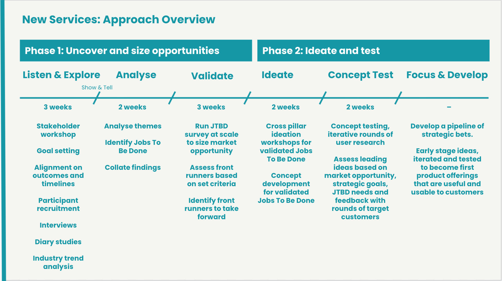 Research approach, using two phases, first phase to uncover and size opportunities, second phase to generate ideas from front runner JTBD areas, and concept test.